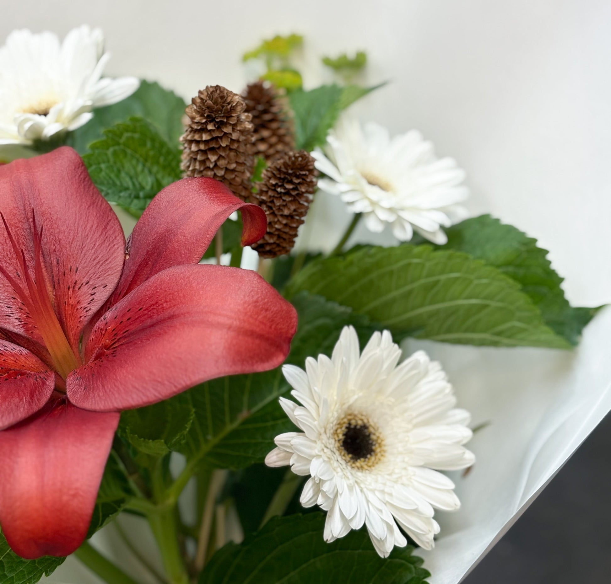 Your Christmas Bunch will be delivered with care by our own in-house couriers, or available to pick up in-store. Please let us know in the order notes if you have any preferences ie ‘white, red and green with extra pinecones!’ or ‘please no lily’s’ and we will do our best to make it happen (not guaranteed).